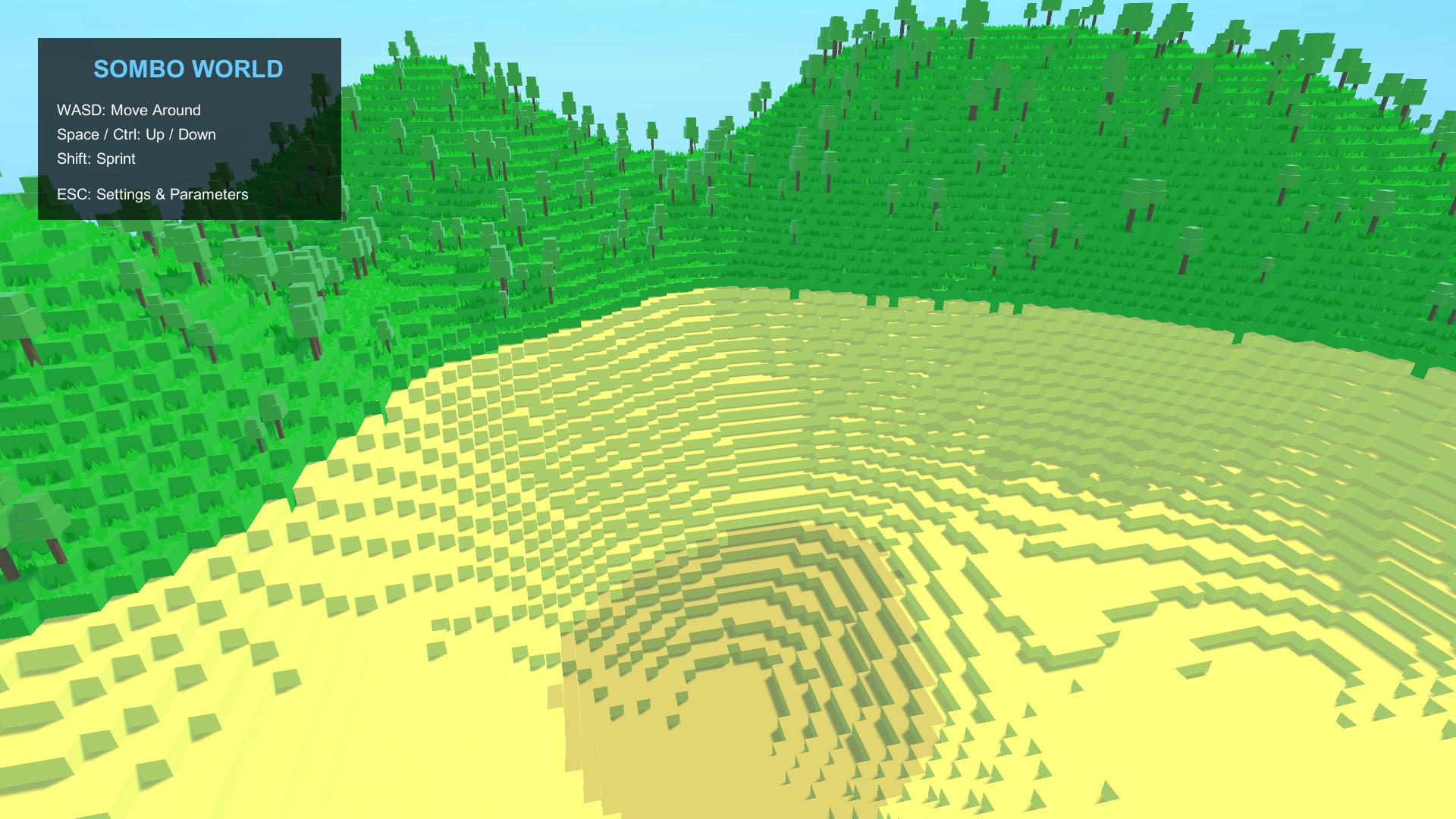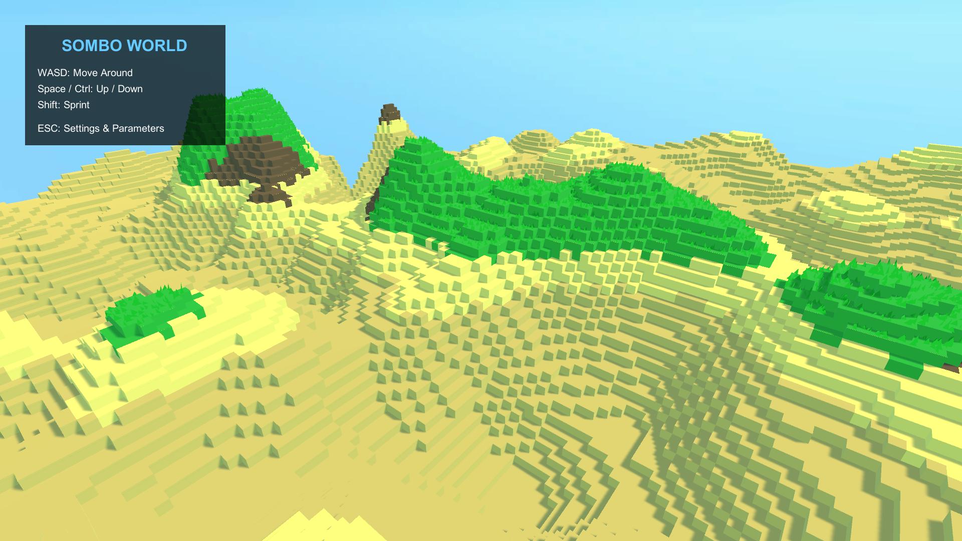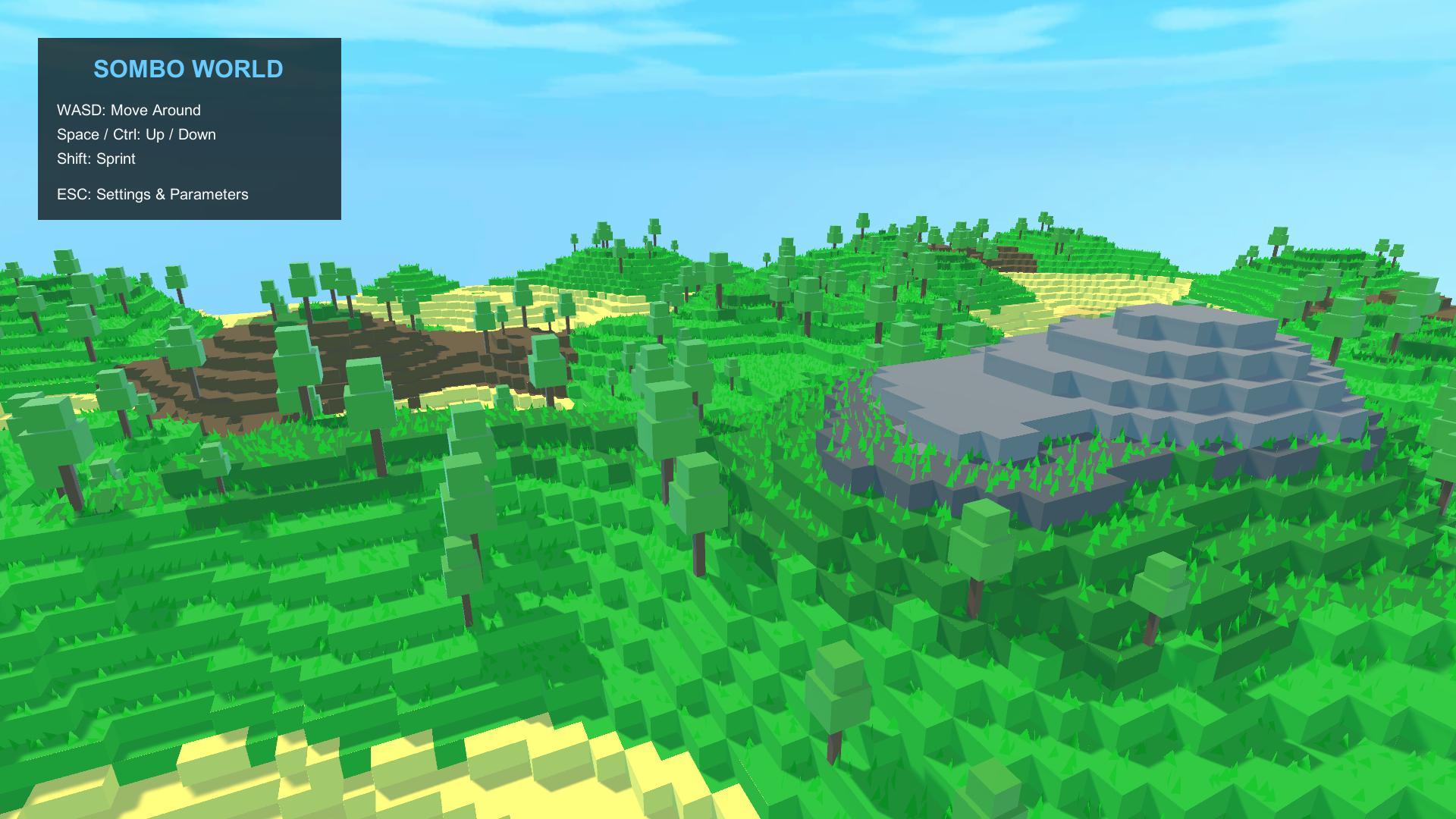 - Two mesh modes: smooth rolling hills or voxel/cube-style block terrain